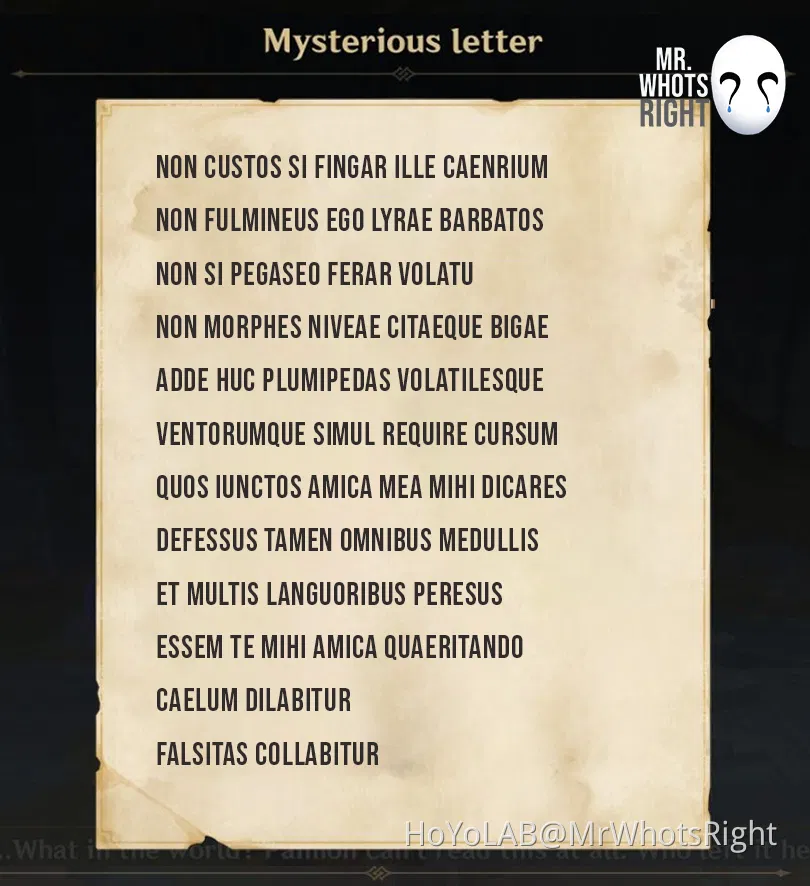 Ok disclaimer I AM RUSTY but i trust my latin word study tool. The letter is encrypted with an unknown script. See how to get Mysterious Letter Letter location obtain Mysterious letter more for.